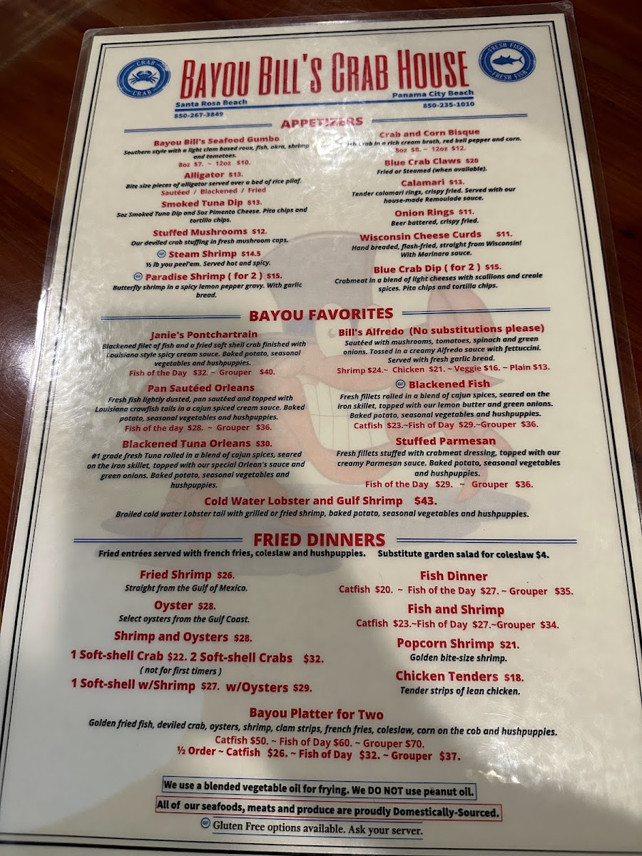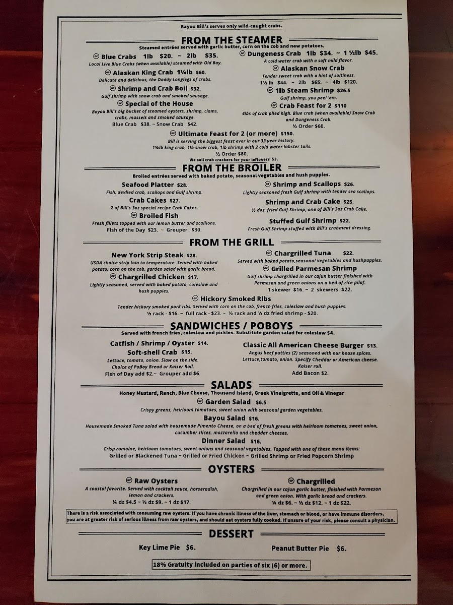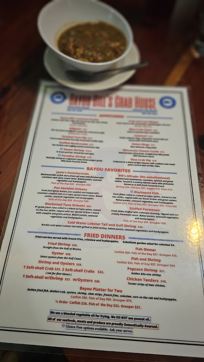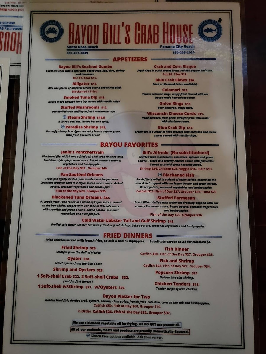 Welcome to Bayou Bill's Crab House, a gem located in Panama City Beach, Florida, where seafood lovers come to indulge in an authentic taste of the South. The menu features an array of fresh, flavorful dishes starting with the Bayou Bill's Seafood Gumbo, brimming with shrimp, okra, and a light clam-based roux. Don't miss out on the Smoked Tuna Dip paired perfectly with crispy pita and tortilla chips—a delightful appetizer experience.